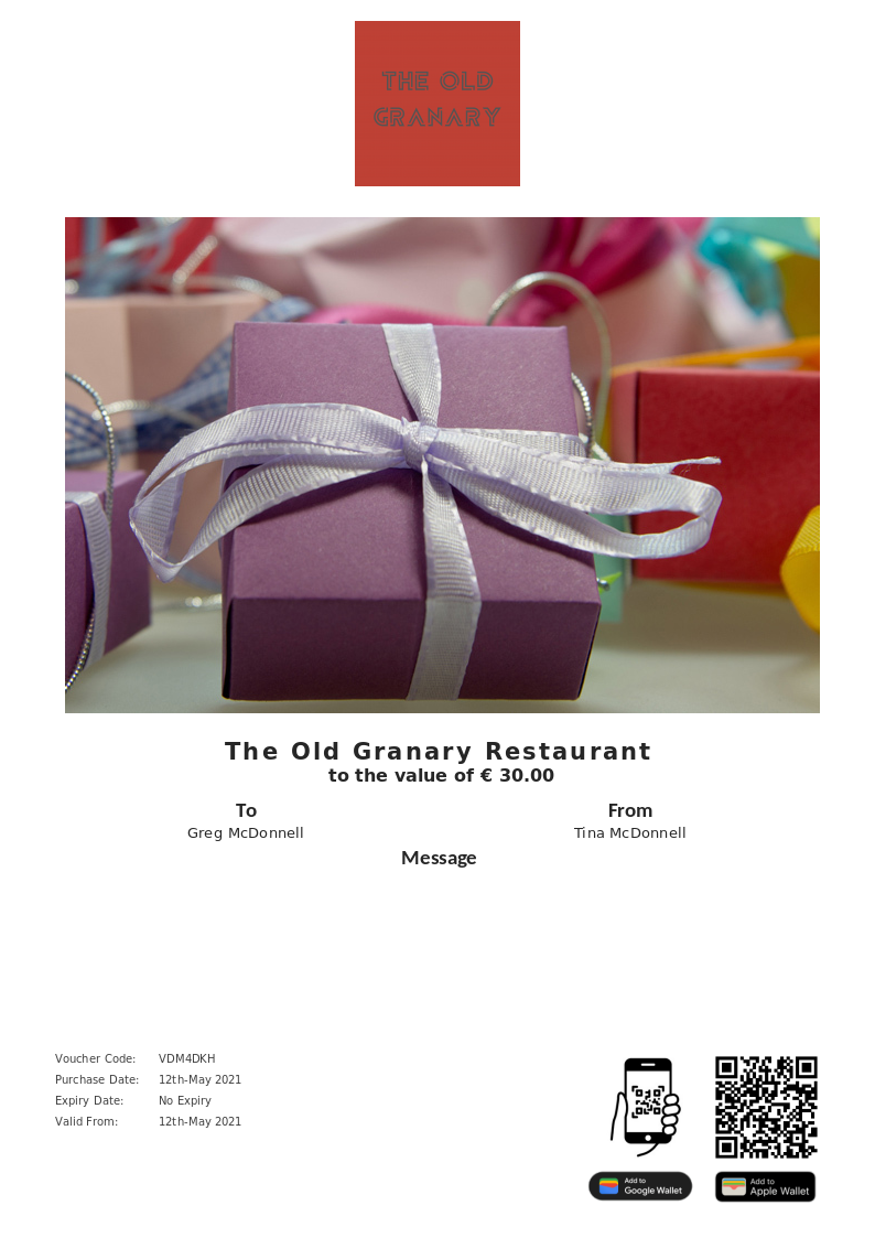 The Old Granary Restaurant allows you to purchase instantly printable gift vouchers, special offers and tickets using the Voucher Connect platform.